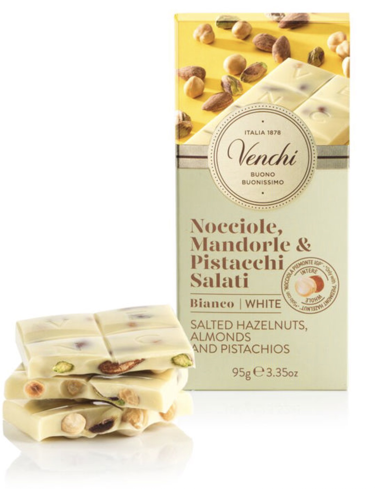 Cette tablette de chocolat blanc associe générosité et caractère avec un mélange de fruits secs entiers légèrement salés : noisettes du Piémont, amandes et pistaches, présents à hauteur minimale de 25 %.